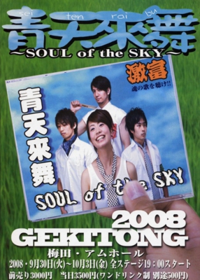 - その第一弾は2001年、初期の「激富」の拠点の劇場だった扇町ミュージアムスクエアで、有機農業と近代農業の戦いを描く『SOUL OF WILDTHINGS 俺の米』。農協の大ちゃんを演じたはだをいじめるフランキーのシーンでは上演中にお年寄りからの非難の声があがる程のリアリティ。続けて翌年には日本の若い株式投資家達の戦いを描く『SOUBA〜SPIRITS OF JAPANESE〜』を製作。刀を台詞に変えた立ち回りが観客を魅了。その老若男女を問わない作風が話題を呼び幅広い世代から支持を得ます。現在の主力メンバーとなる内村哲哉や小野木秀樹がここで加わります。