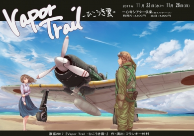 『俺たちは絶対に死なない!!』大きな誓いを心に秘めた大日本帝国軍の特殊部隊があった。決して公には出来ない想い…、ただその時を待ち続ける。彼らに課せられた任務とは。何の為に戦い、誰の為に生きるのか。第二次世界大戦、舞台は沖縄。慣れ親しんだ山や川、どこまでも続く美しい海。自分の帰りを待つ家族や恋人の為に、生まれ育った国家存亡の命運を小さな身体で背負い込む。激戦の最前線を生きる若者たちは、何を想ったのか。そこに未来は、夢はあったのか。『俺が戦争を終わらせてやる!』1人の男を生かす為、次々と誓いを破る仲間たち。やがて、真っ青な空が夏を告げる。彼らの想いで作った、長く真っ直ぐ伸びる『Vapor Trail(ひこうき雲)』は夢に見た平和へと繋がるのか…。 ※フライヤーをクリックすると「期間限定公演特設SITE」へ