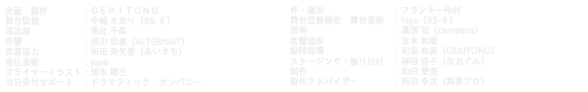 企画・製作:GEKITONG 作・演出:フランキー仲村 舞台監督:中嶋 さおり(BS-Ⅱ) 舞台監督補佐:hige(BS-Ⅱ)
